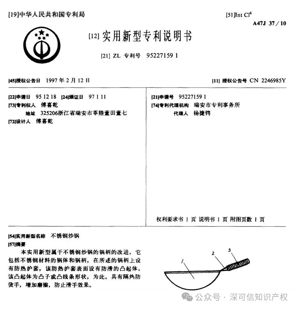 这串专利号的魔力,源于知识产权的公开性。根据《专利法》规定,专利授权后,申请人、专利权人等信息对公众开放查询。在没有二维码和溯源系统的1995年,傅家父子花费数百元申请的这枚实用新型专利,核心是锅柄隔热防烫、增加摩擦的功能改进,既解决了当时的用户痛点,又成了防止仿冒的“护身符”;更在30年后成了连接产品与厂家的“时空纽带”。