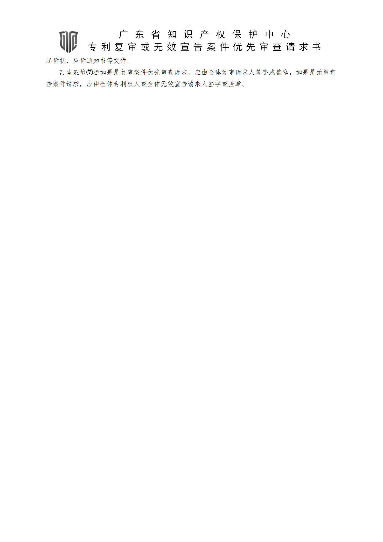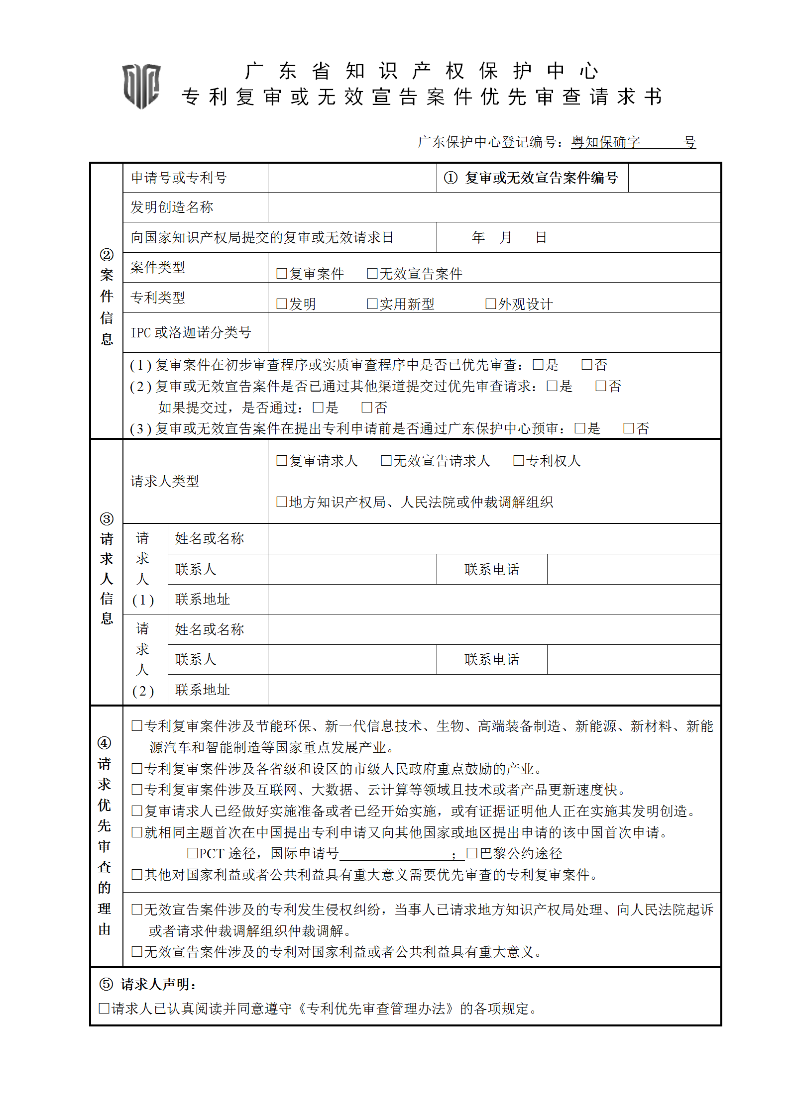 1.广东省知识产权保护中心专利复审或无效宣告案件优先审查请求书