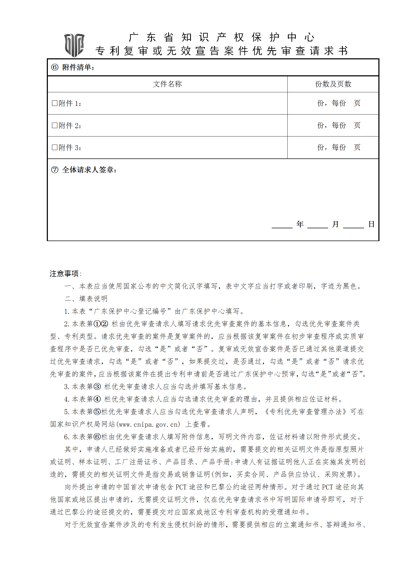2.《广东省知识产权保护中心专利复审或无效宣告案件优先审查请求书》(见附件1),需加盖公章;