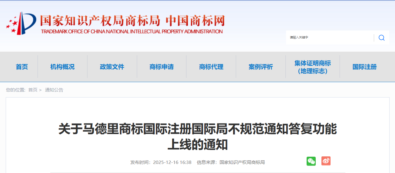 为进一步提升商标网上申请系统服务能力,更好地服务商标国际注册申请人,自2025年12月18日起,马德里商标国际注册国际局不规范通知答复功能正式上线。