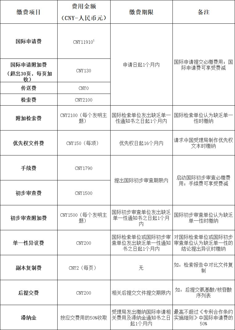 [1] 申请费、申请附加费和手续费如因汇率波动过大等原因需调整,费用标准将另行公布,具体金额请参照PCT专栏重要通知内公布的最新费用标准。