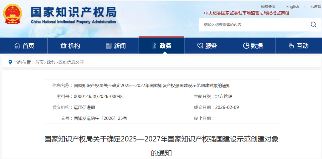 国家知识产权局关于确定2025—2027年国家知识产权强国建设示范创建对象的通知